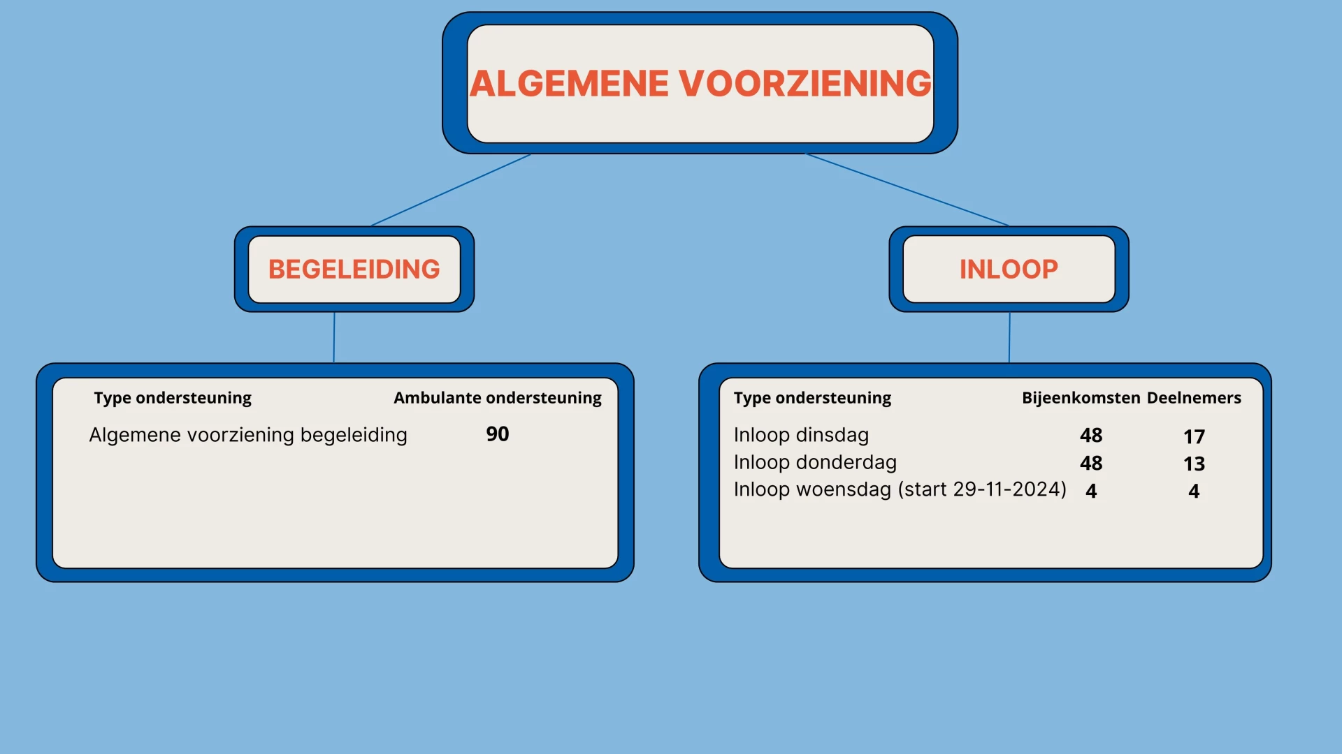 Er zijn twee vormen van algemene voorzieningen in de gemeente Pekela: de algemene voorziening begeleiding en de algemene voorziening inloop. De algemene voorziening begeleiding biedt individuele begeleiding aan inwoners van Pekela. De algemene voorziening inloop richt zich op het organiseren van diverse groepsactiviteiten die de participatie van inwoners bevorderen. Tot april 2024 waren De Badde en Cosis samen verantwoordelijk voor deze algemene voorzieningen binnen de gemeente Pekela. Vanaf april neemt De Badde deze verantwoordelijkheid alleen op zich. In figuur 5 wordt de algemene voorziening schematisch weergegeven.