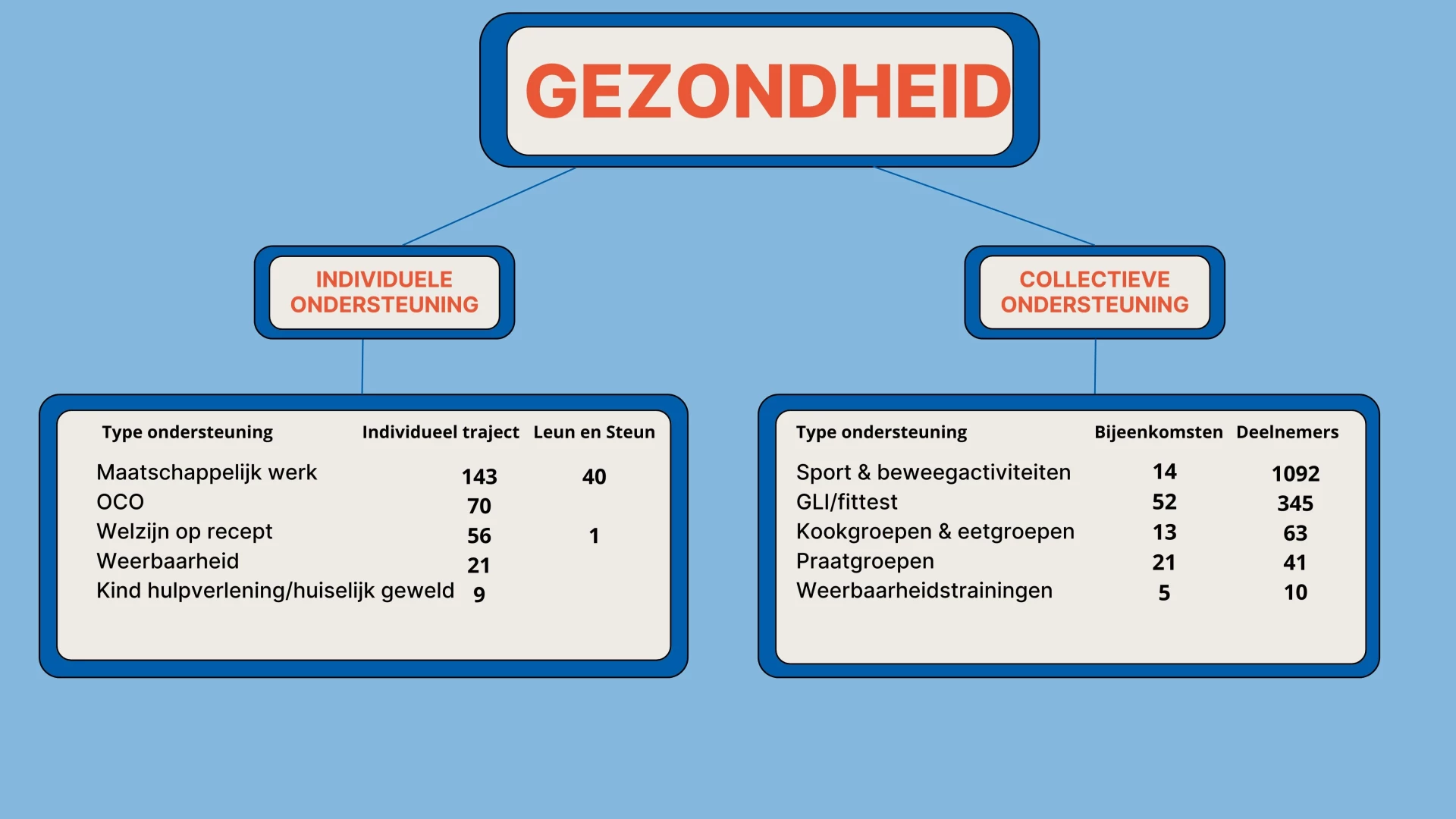 Binnen het thema Gezondheid zien we in 2024 een toename van het aantal individuele trajecten ten opzichte van 2023. Het aantal trajecten steeg van 234 naar 299, terwijl het aantal leun & steun-trajecten gelijk bleef op 41. De groei is zichtbaar binnen het algemeen maatschappelijk werk, Welzijn op Recept en de ondersteuning bij huiselijk geweld. Het aantal trajecten voor onafhankelijke cliëntondersteuning (OCO) bleef stabiel; we blijven OCO actief onder de aandacht brengen bij inwoners en ketenpartners. Mantelzorgondersteuning richt zich voornamelijk op informatie- en adviesvragen. Aantallen voor activiteiten gericht op vitalisering van ouderen worden niet apart geregistreerd, aangezien deze onder andere vallen binnen sport- en beweegactiviteiten.