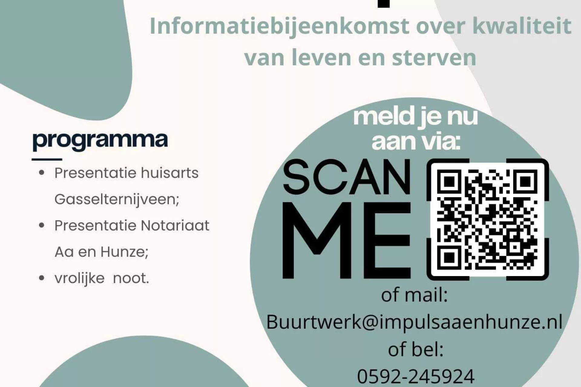 Op woensdag 11 september vond de informatiebijeenkomst De dood uit de pot plaats in Gasselternijveen. Hierbij ging het over de kwaliteit van leven en sterven. Het was erop gericht om belangrijke levensvragen over de laatste levensfase bespreekbaar te maken, wat de rust en duidelijkheid vergroot voor zowel inwoners als zorgprofessionals. Een huisarts en een notaris gaven een presentatie en er was nog een vrolijke noot.