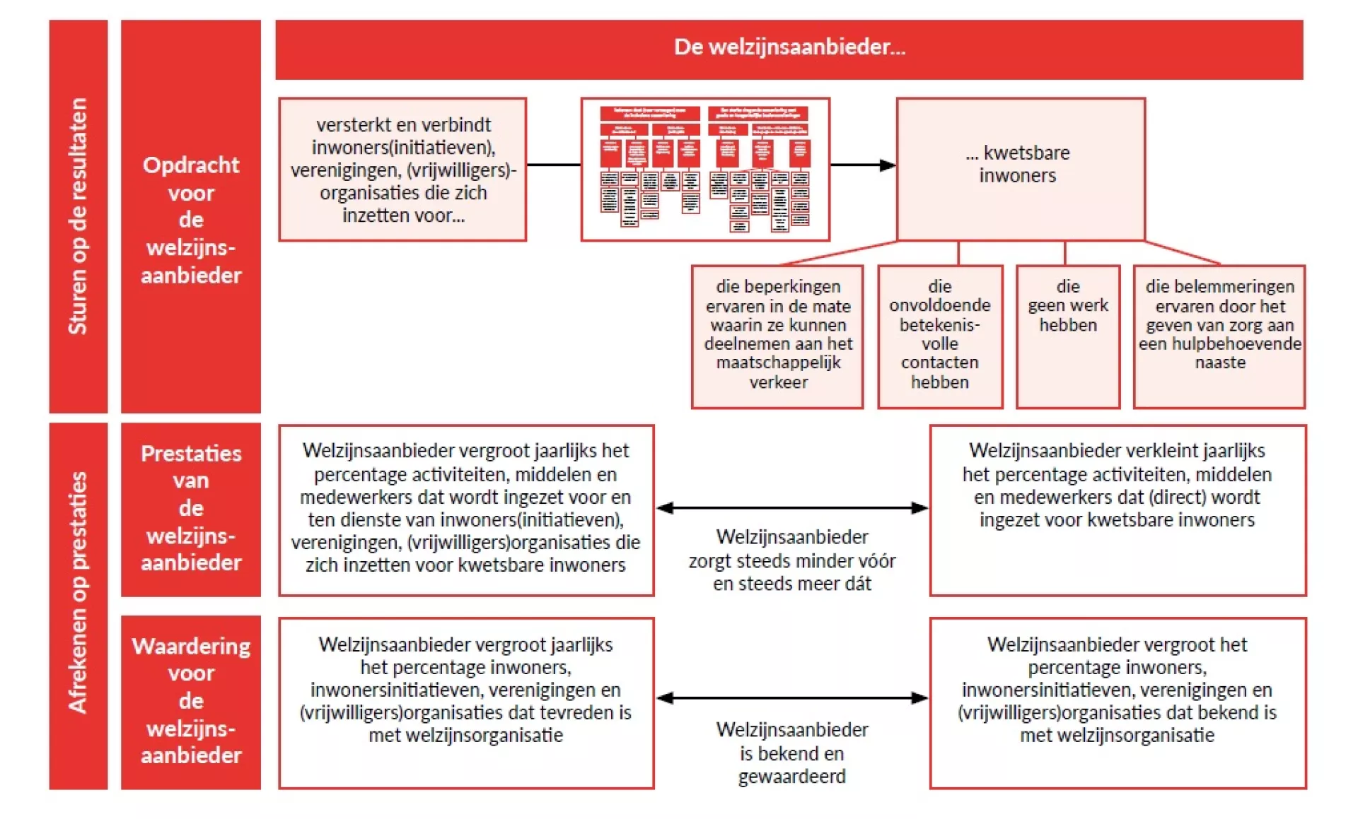 Sociaal Werk De Kear zet zich lokaal en dichtbij in voor het welzijn van de inwoners van de gemeente. De medewerkers ondersteunen inwoners en motiveren hen om vanuit eigen kracht en hun talenten regie te nemen over hun leven en met elkaar te zorgen voor een leefbare, sterke samenleving. Dit betekent dat er ingezet wordt op steeds minder “zorgen vóór” en steeds meer “zorgen dat”. Dit wordt gedaan vanuit de overtuiging dat mensen verantwoordelijk zijn voor hun eigen leven, maar ook invloed kunnen uitoefenen op het leven van hun naasten. In de figuur hieronder is de opdrachtbeschrijving voor Sociaal Werk De Kear gevisualiseerd.