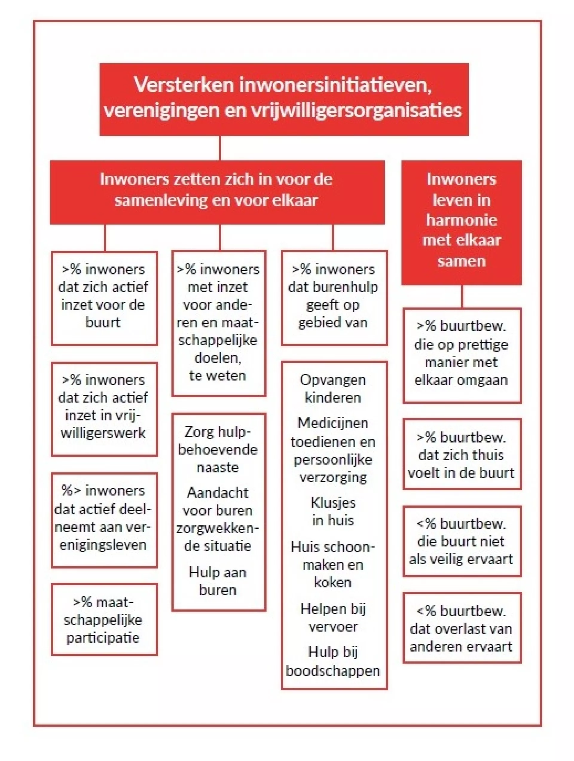 In de opdrachtbeschrijving zijn voor de doelstelling Versterking inwonersinitiatieven, verenigingen en vrijwilligersorganisaties een aantal indicatoren gedefinieerd. Deze indicatoren zijn hieronder in een tabel samengebracht.