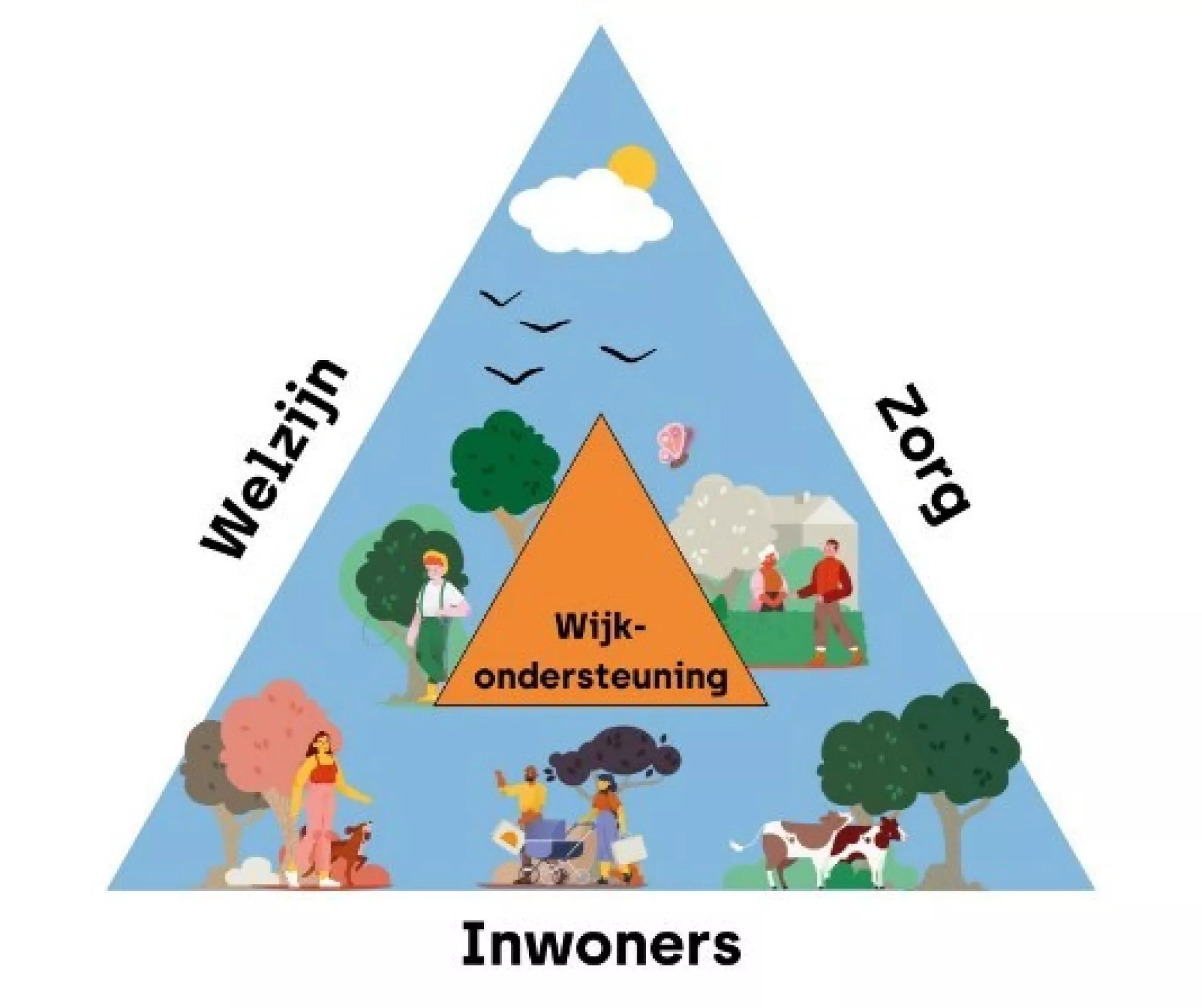 Binnen de zorgzame buurt is initiatief vanuit inwoners belangrijk en zijn er ‘warme plekken’ en ‘milde werkverbanden’. Dat zijn fysieke locaties waar mensen zich welkom voelen, waar hun kwaliteiten gezien worden en waar zij bij kunnen dragen op een manier die bij hen past. Een plek van waaruit korte lijnen zijn naar voorzieningen op het gebied van welzijn, gezondheid, werken, wonen. En waar verbindingen met netwerken en inwonersinitiatieven in de buurt gelegd kunnen worden. Bij het nadenken over de zorgzame buurt vormt de afgebeelde driehoek van inwoners, welzijn en zorg een ontwikkelkader. We gebruiken het om te ontwikkelen in een samenspel tussen inwoners, welzijn en zorg.